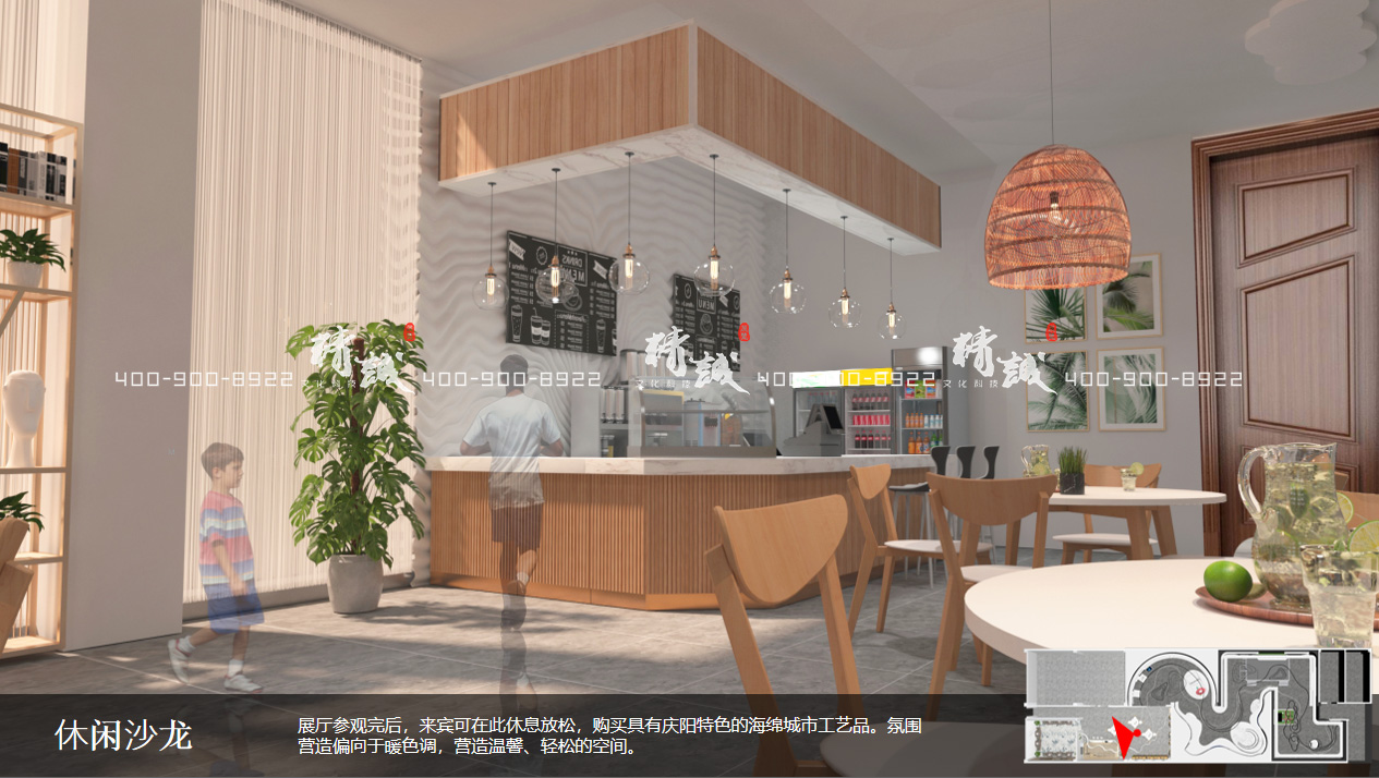 规划馆参观完后,来宾可在此休息放松,购买具有庆阳特色的海绵城市工艺品。氛围营造偏向于暖色调,营造温馨、轻松的空间。