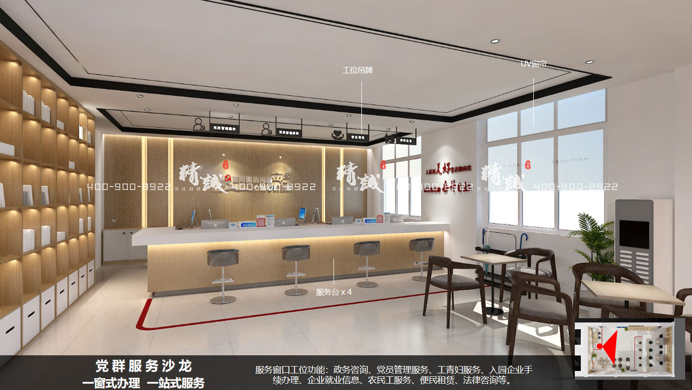 服务窗口工位功能:政务咨询、党员管理服务、工青妇服务、入园企业手续办理、企业就业信息、农民工服务、便民租赁、法律咨询等。