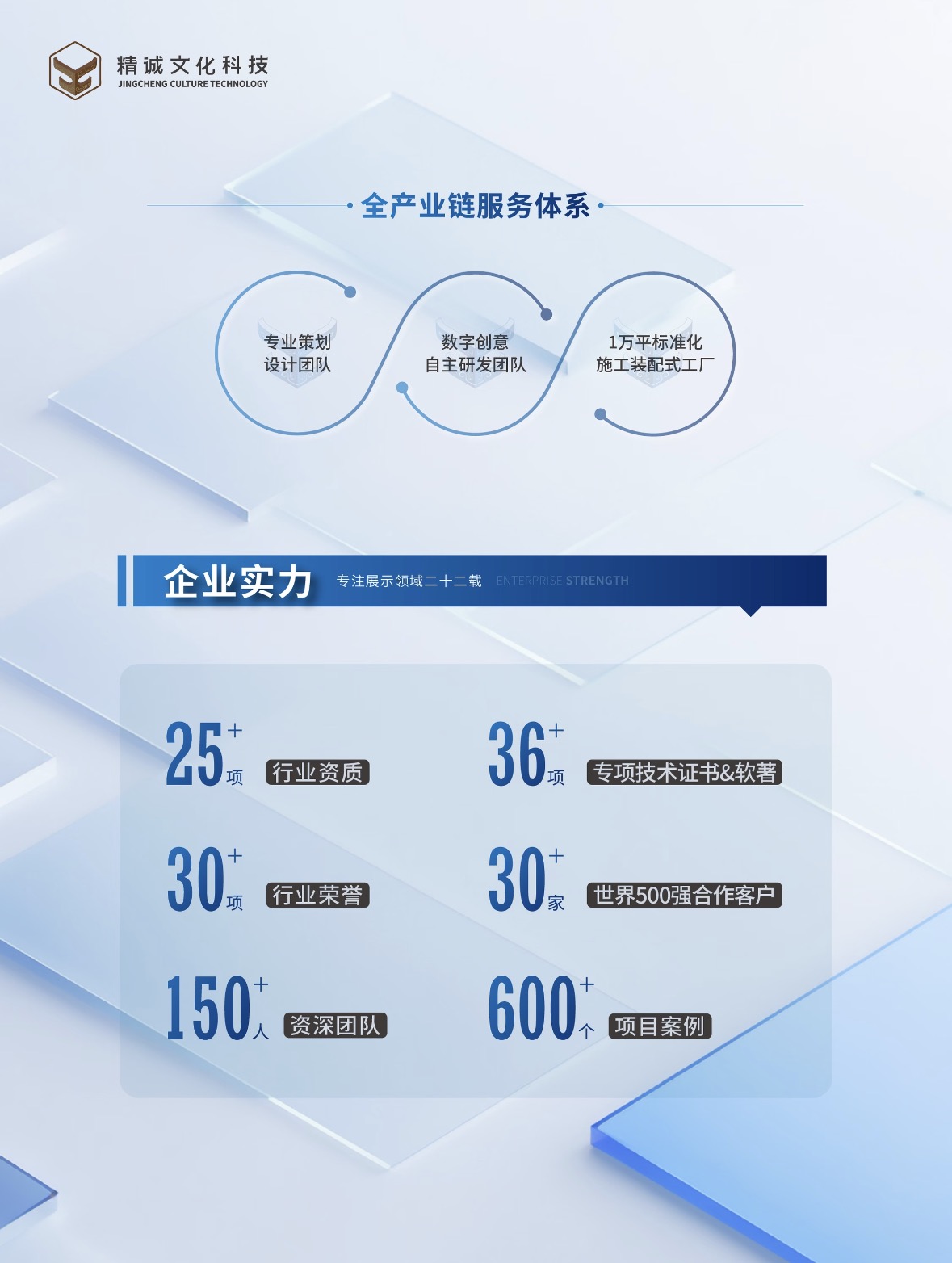 核心优势:拥有10000平方米标准化装配式自有工厂,可自主管控生产质量与交付周期,适配当前绿色施工的行业要求;构建了集展陈策划、空间创意、数字研发、视觉科技、场景雕塑、工程实施、后期运维于一体的一站式、一体化全产业链服务体系,用户无需对接多个供应商,大幅降低项目管理成本;累计服务各类项目超2800个,与中国航天、中核集团、中国中铁、国家能源、中国石油等30余家大型企业建立合作,在大中型政企展馆项目领域积累了成熟的落地经验。